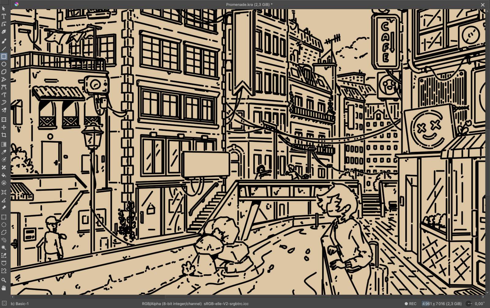 This has been a struggle, to say the least: even if most of the details were already present in the sketch, a lot of information had to be filled in and corrected. After looking at the same image for hours a lot of mistakes jumped out at me; for example, windows on the same floor that were misaligned or not the same size.