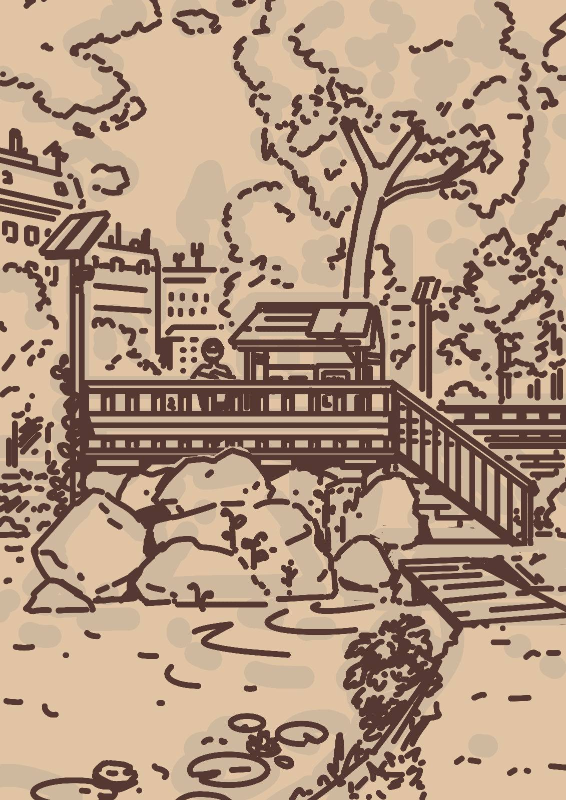 Back to the sketch, I really enjoyed thinking about the little details, like what kind of furniture this place could have, what the solar panels are useful for, or making sure there is a little terrace in front, in case the ground becomes muddy.