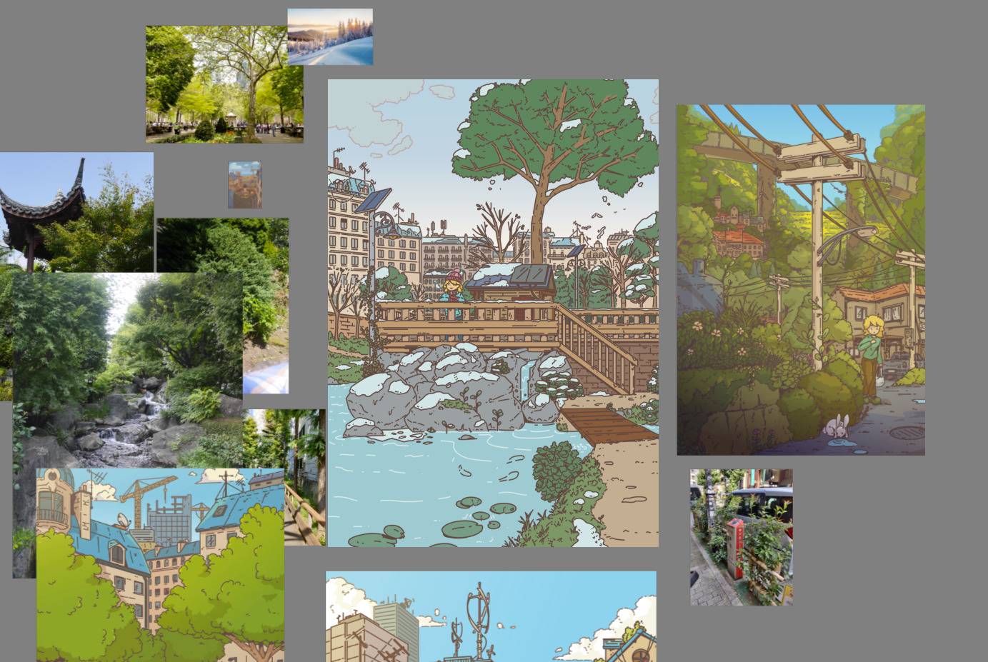 The first step was to do the color blocking: give every element a color and a layer so that I can adjust them later. I often do it by group; for example, all the tree trunks are on one layer and the foliage on another.