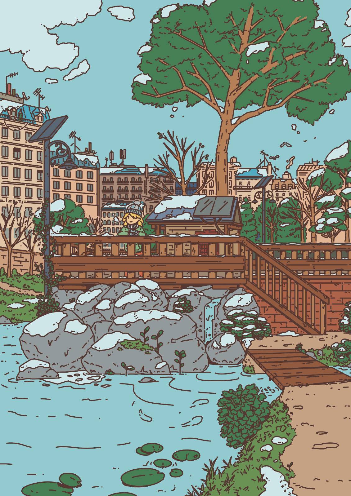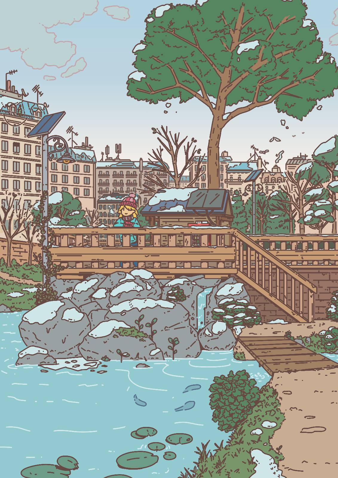 Once done, what I like to do is adjust the color of the lines: making the contour lighter for elements that are further back is something that I do a lot in my usual illustrations, but here it was especially needed to give the impression that the scene is slightly foggy. And it helps the character stand out!