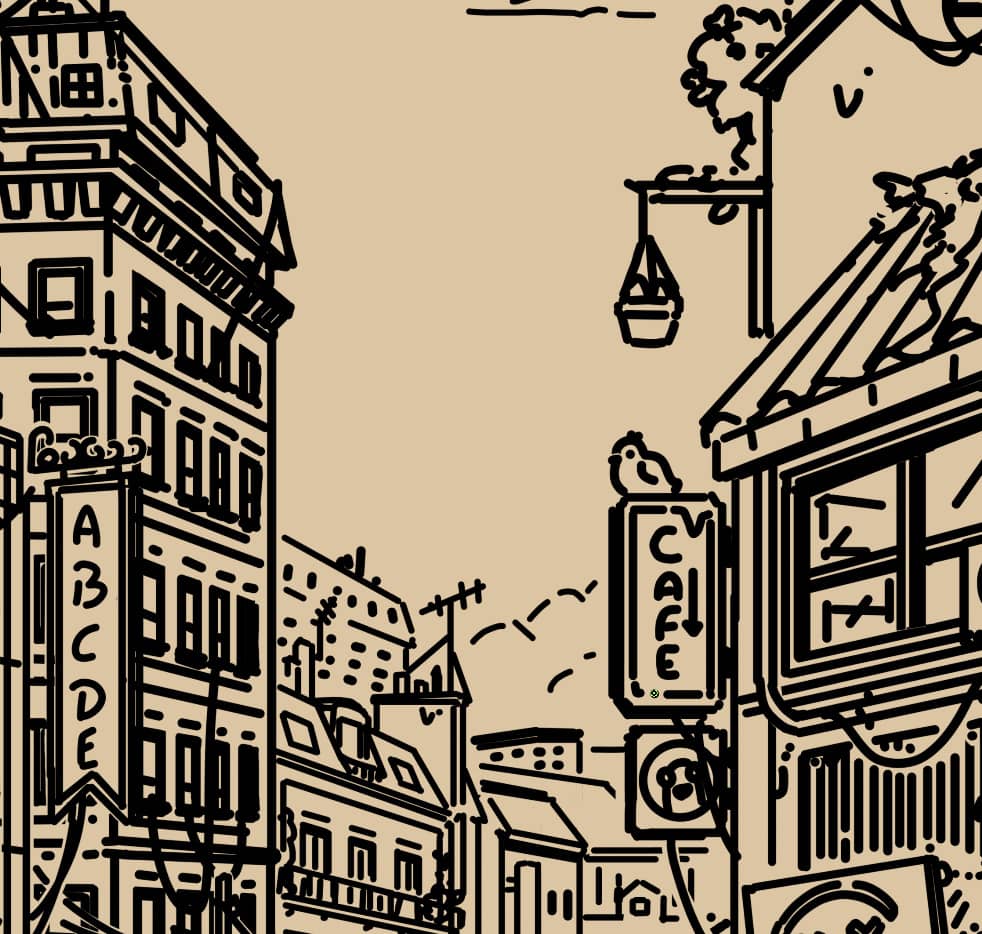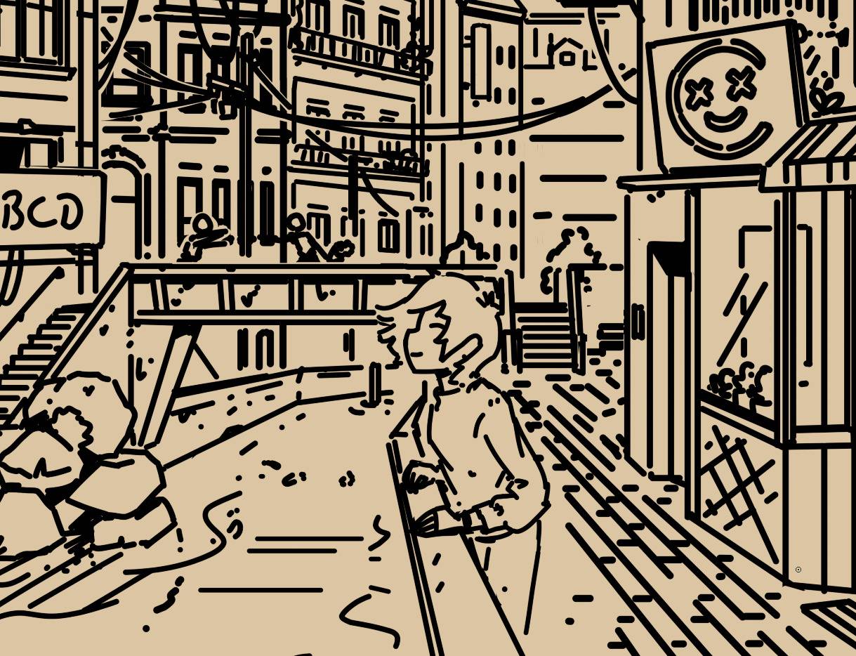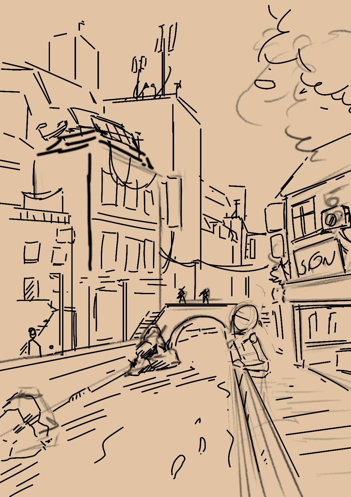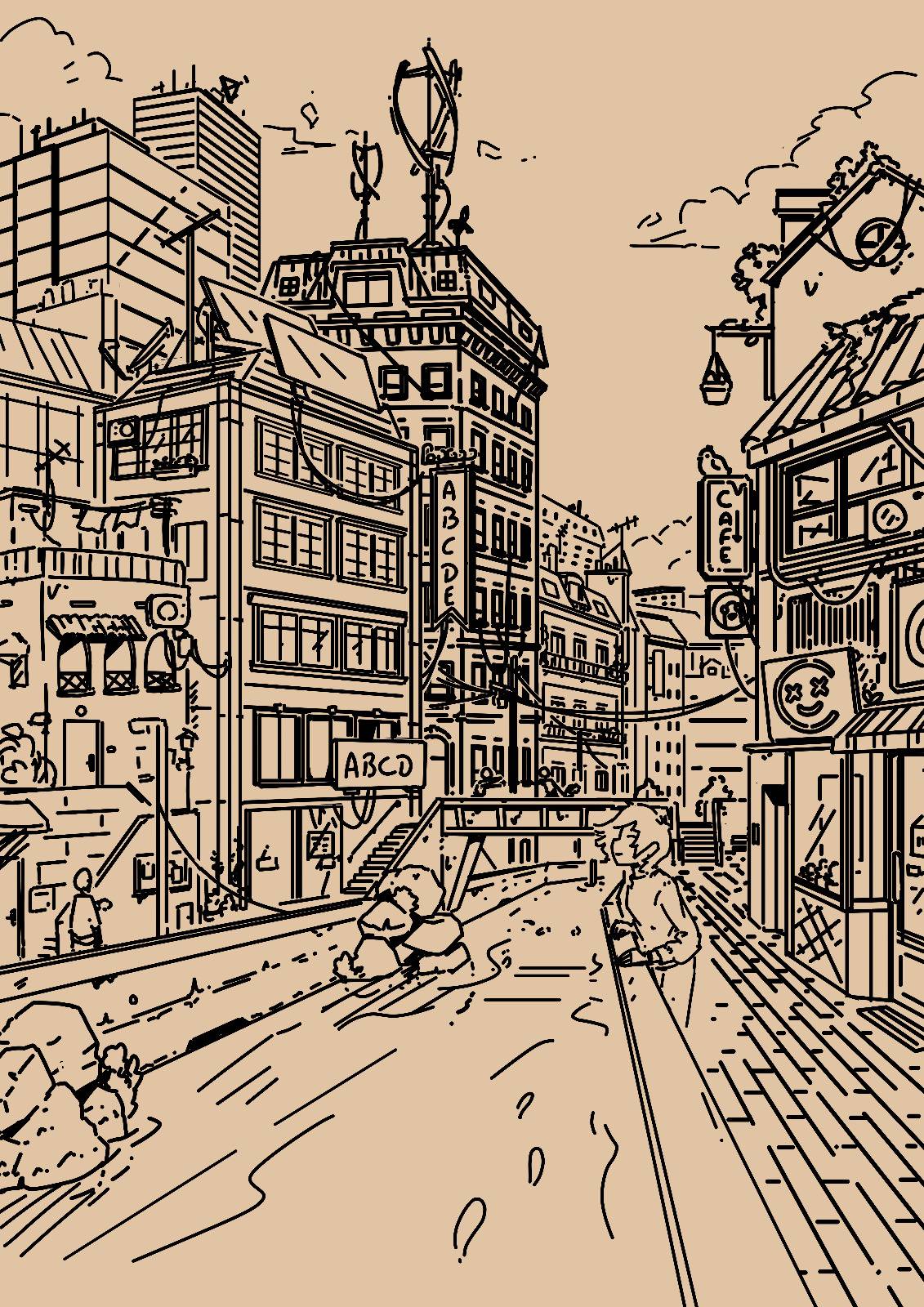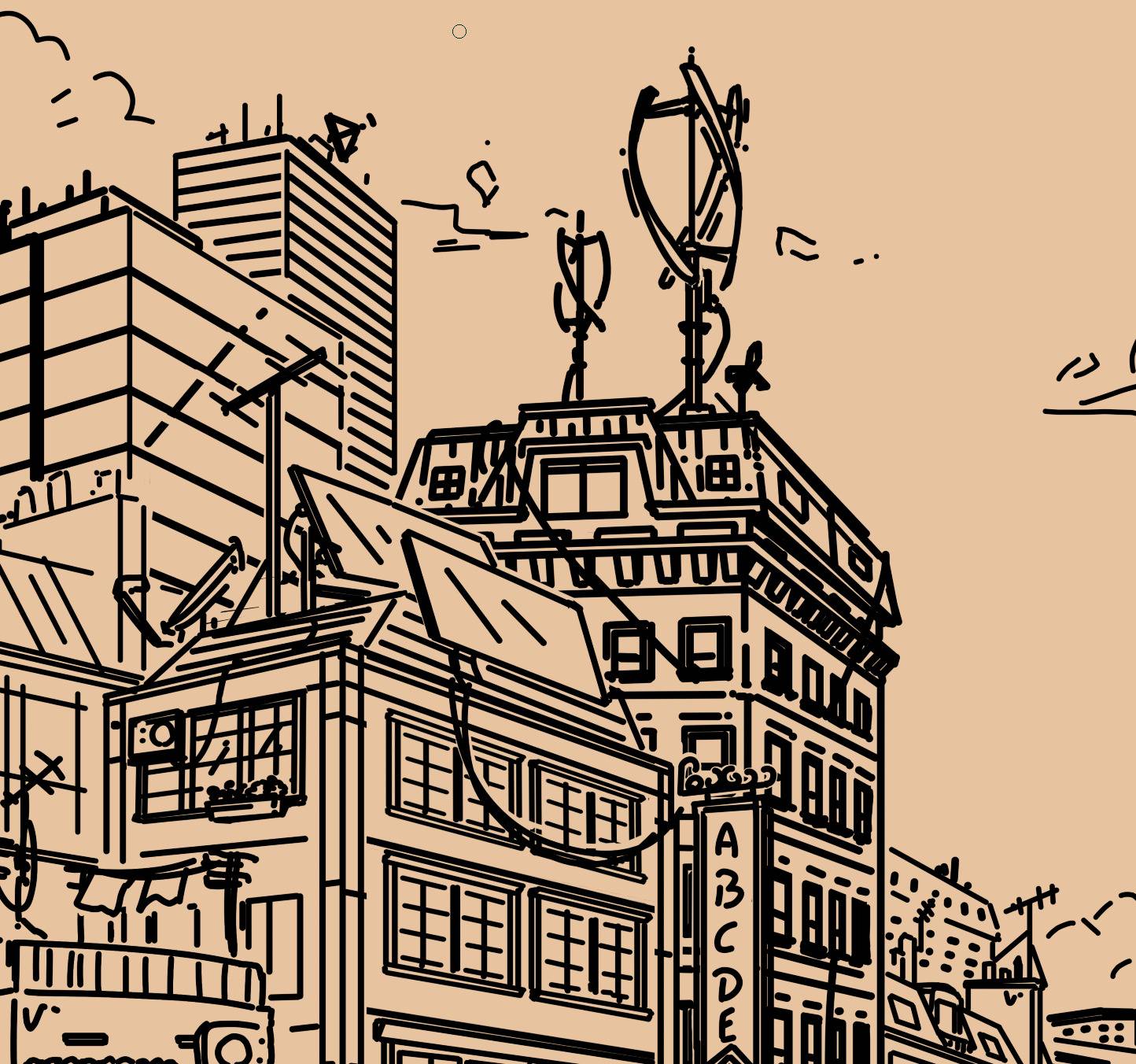 That’s because while drawing I realized: “Wait, horizontal wind turbines don’t make much sense in the middle of the city. It should be vertical instead.”