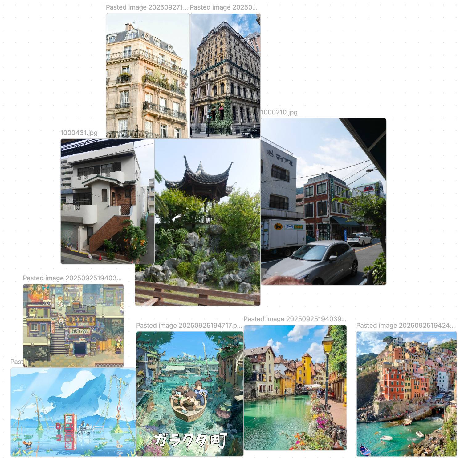 Building on this, I then created a moodboard using Obsidian’s Canvas feature. It’s rare that I organize my references this way, but this was a great way to figure out where I wanted to go!