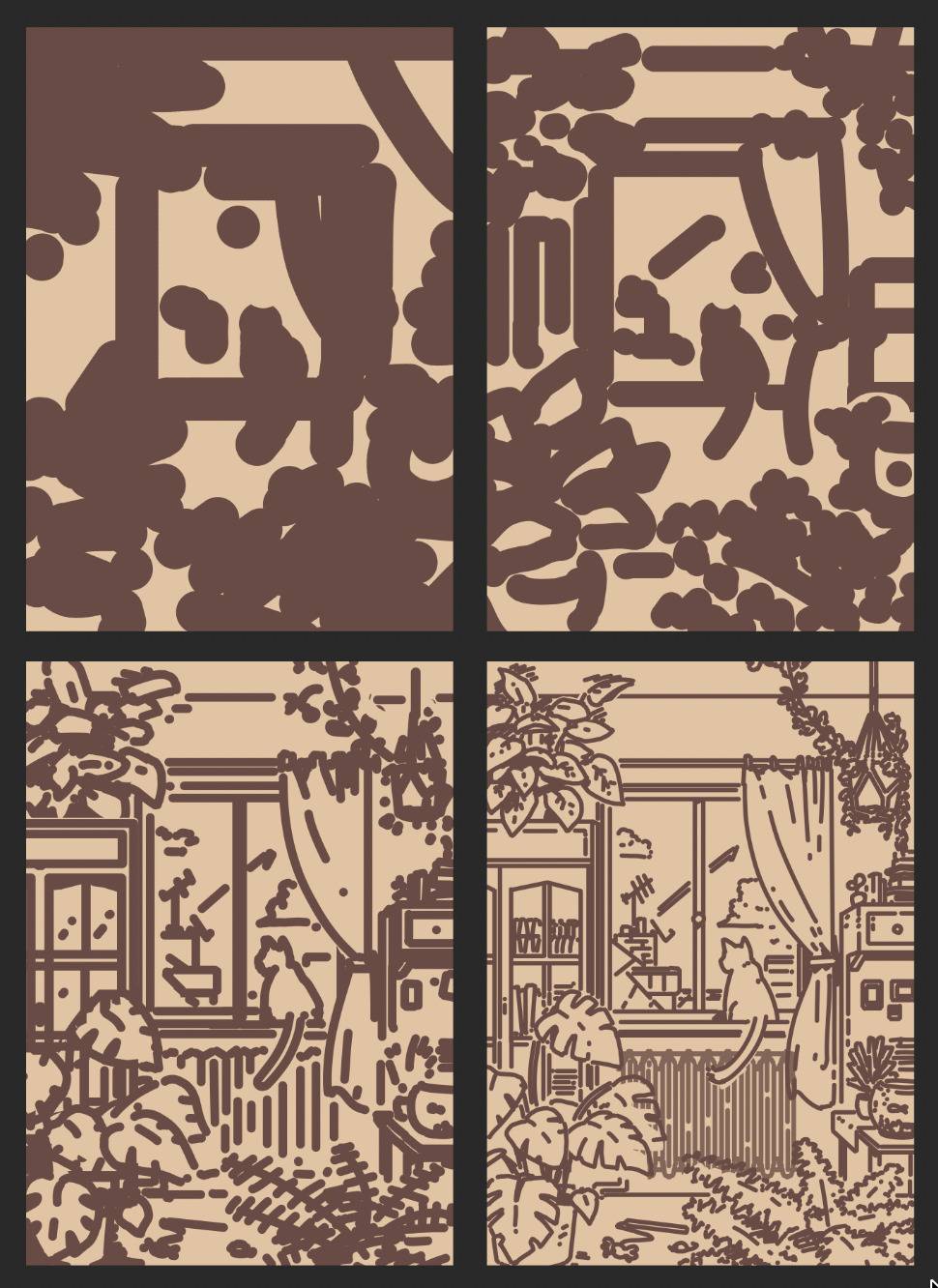 As you can see, I was pretty keen on this idea of a cat sitting by the window, so I went with it :) After a few more iterations back on digital, here is the sketch I came up with!
