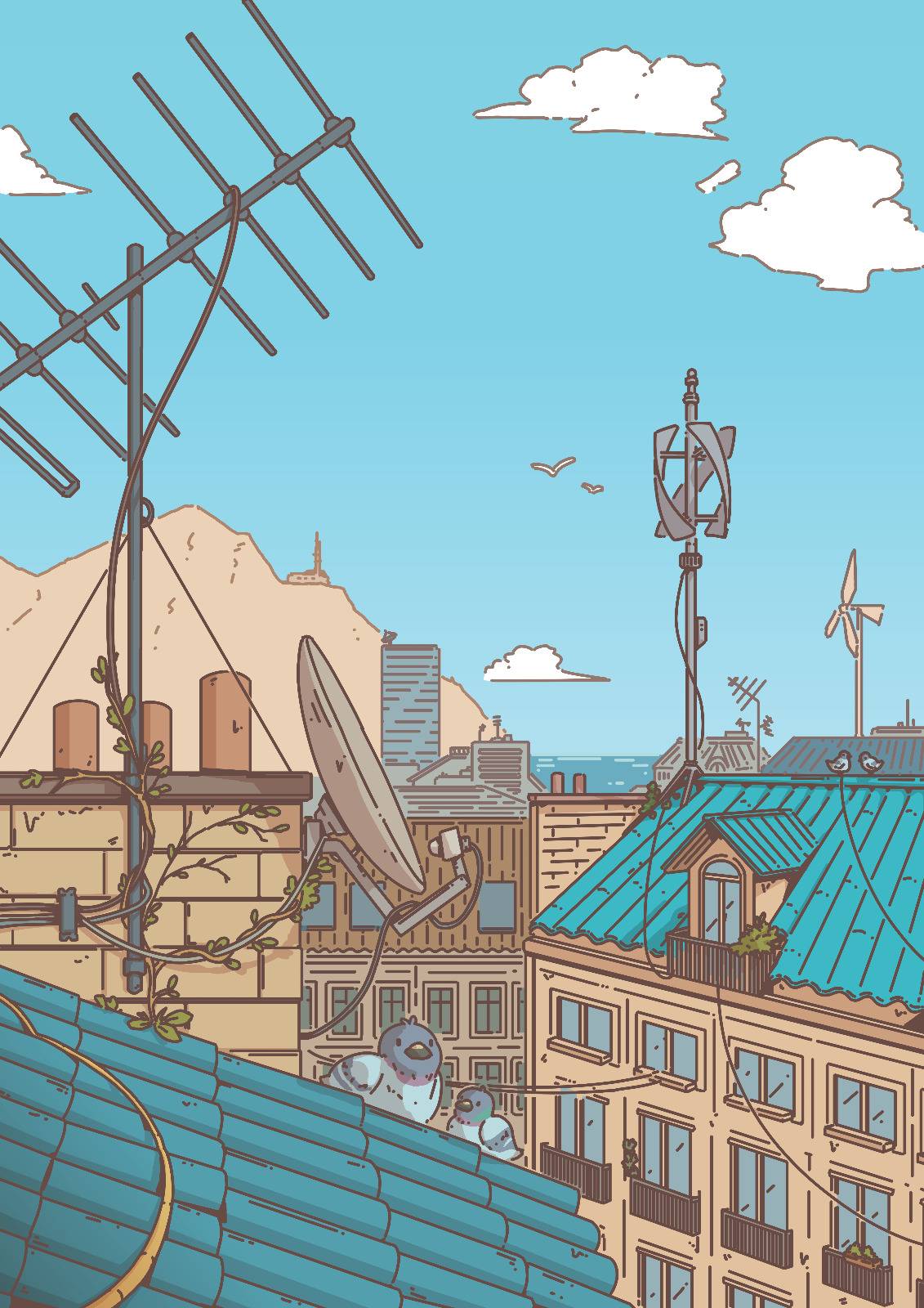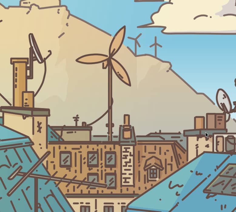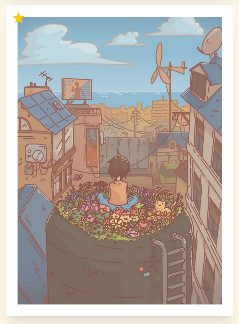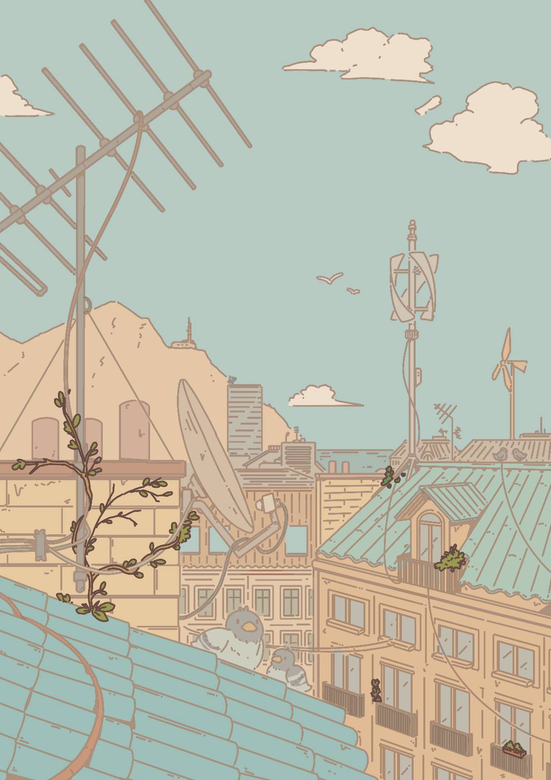 The wooden wind turbine here has become a staple of this part of the city. I first drew it in “Make the World your Garden” in February 2024! It’s sometimes looks inconsistent between illustrations, but the spirit is there. I just think it looks neat.