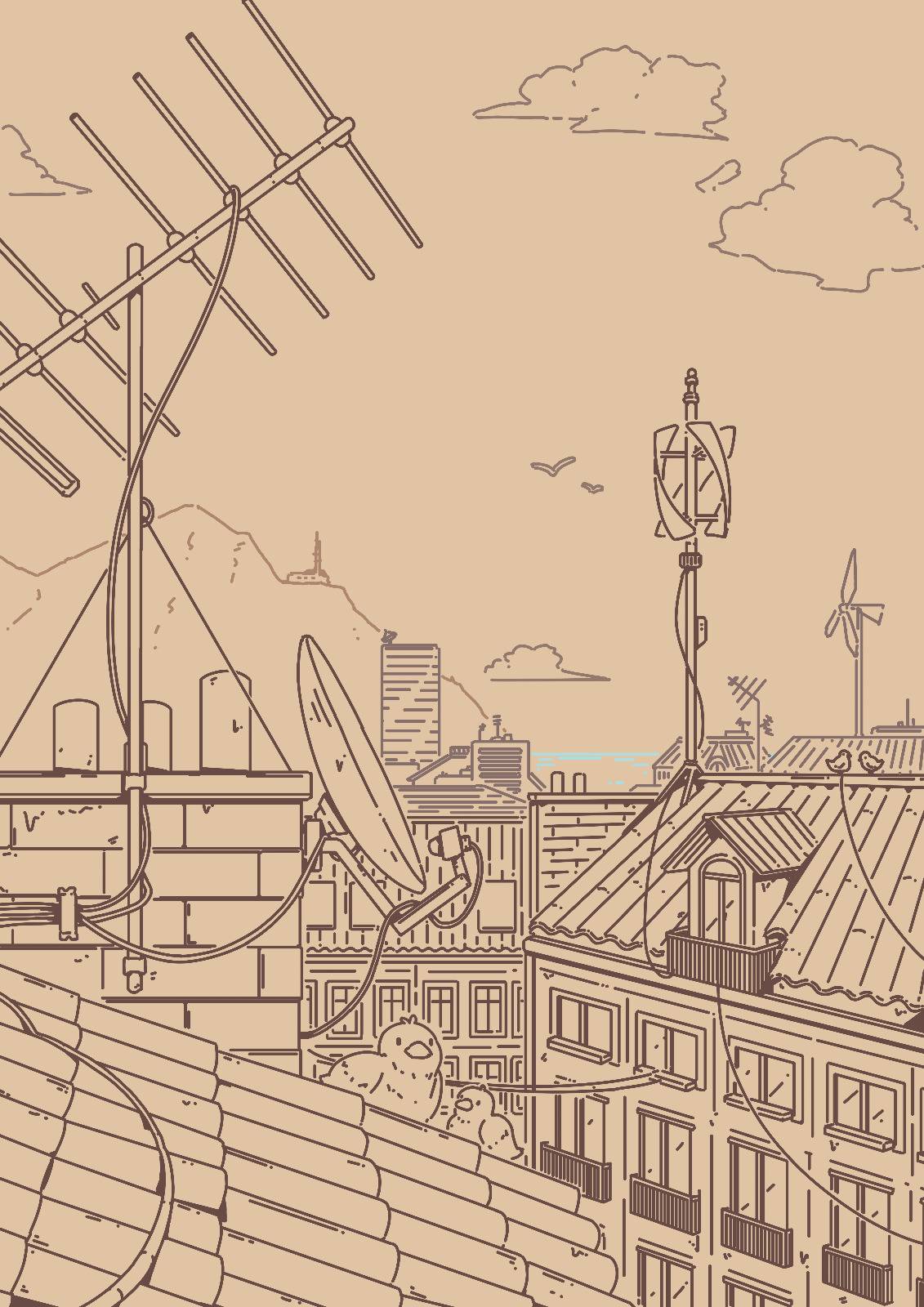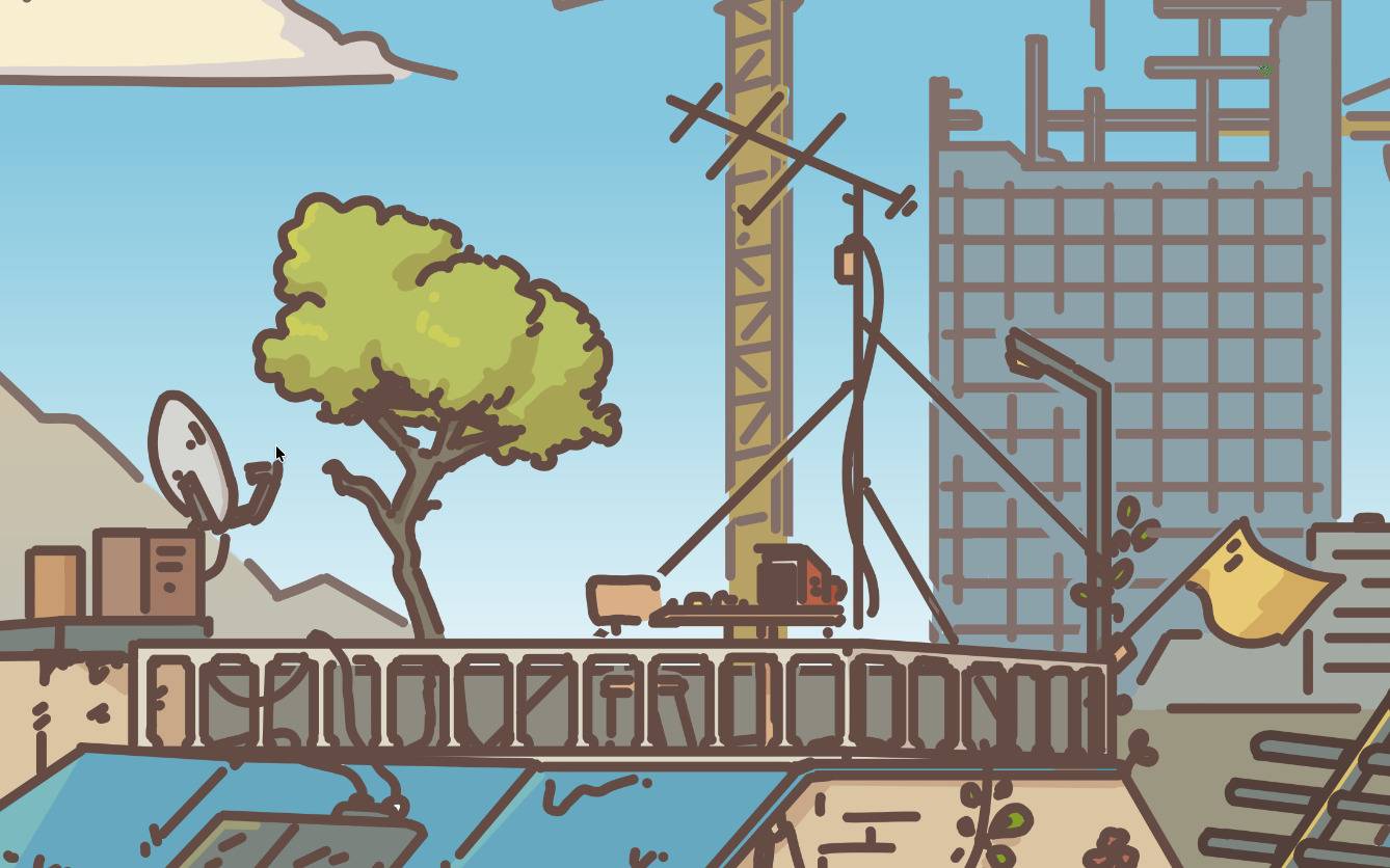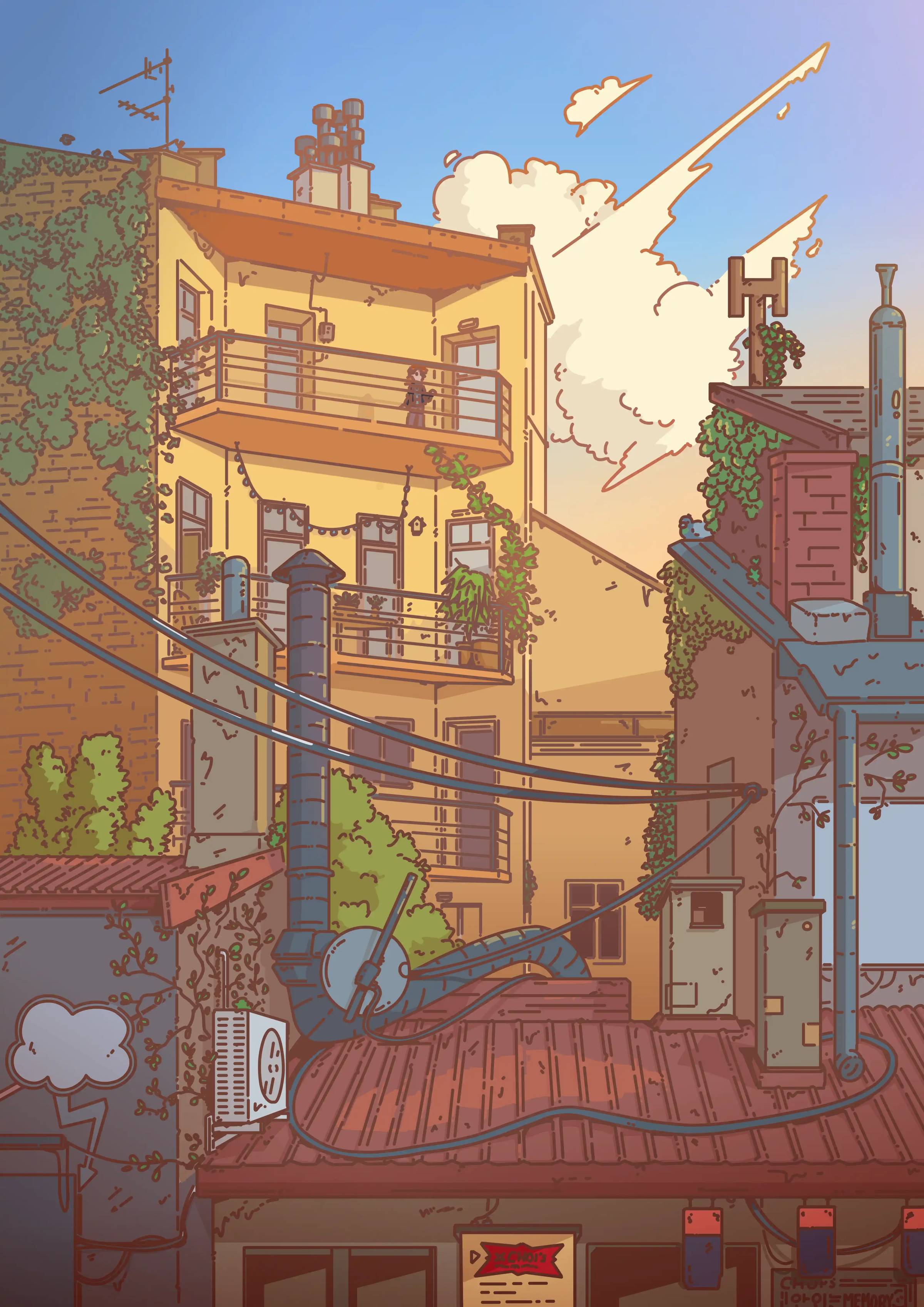 The wooden wind turbine here has become a staple of this part of the city. I first drew it in “Make the World your Garden” in February 2024! It’s sometimes looks inconsistent between illustrations, but the spirit is there. I just think it looks neat.