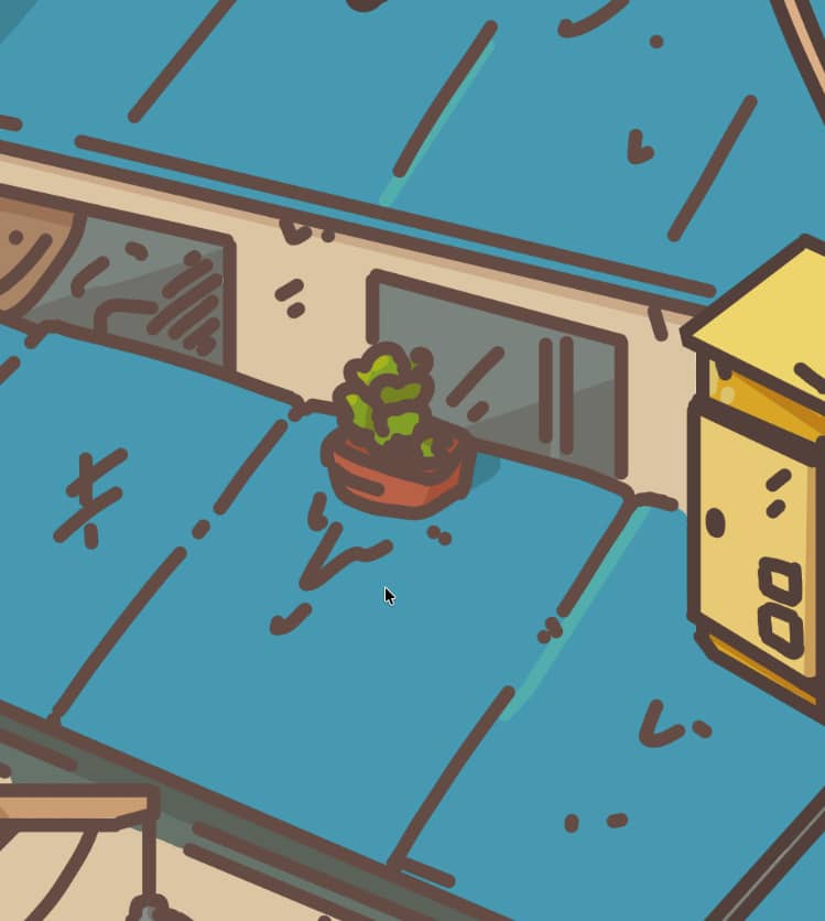 The flower pot on the roof would realistically slide down, but you can see lines underneath showing that water used for the plant has been dripping down on the tiles.