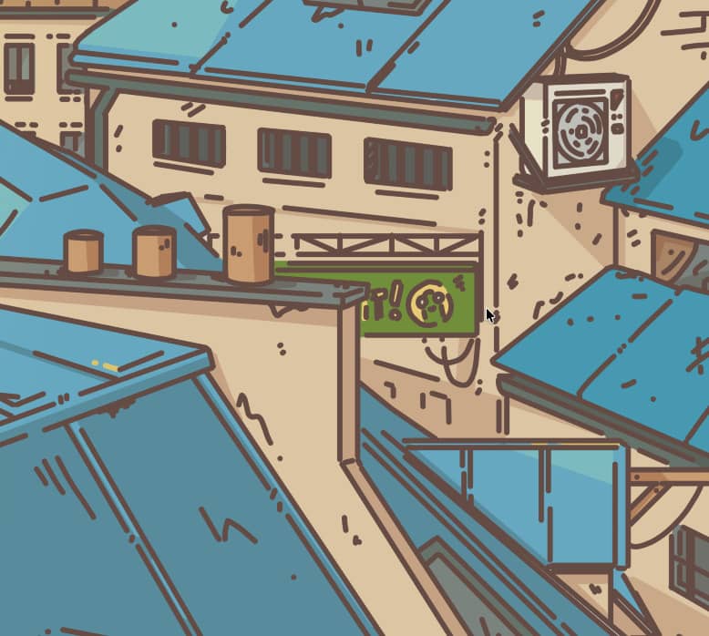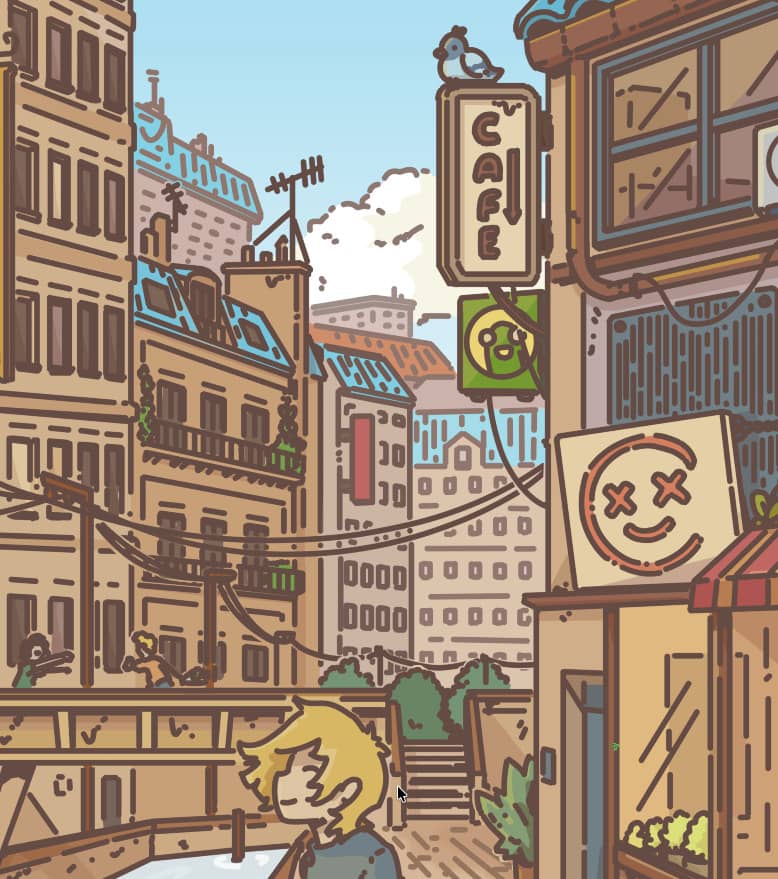 And finally, you can see hanging above the street a sign for Froggy’s! The recurring and fictional convenient store that I like to include in my illustrations :)